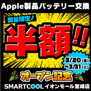 オープン初日~ 3/31 日まで Apple 製品のバッテリー代半額キャンペーンを開催いたします!